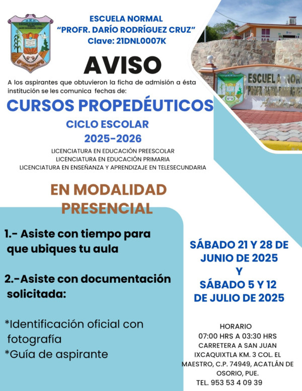 La Escuela Normal "Profr. Darío Rodríguez Cruz" (Clave: 21DNL0007K) informa a los aspirantes que obtuvieron ficha de admisión, las fechas oficiales para los Cursos Propedéuticos del Ciclo Escolar 2025–2026, en modalidad presencial.